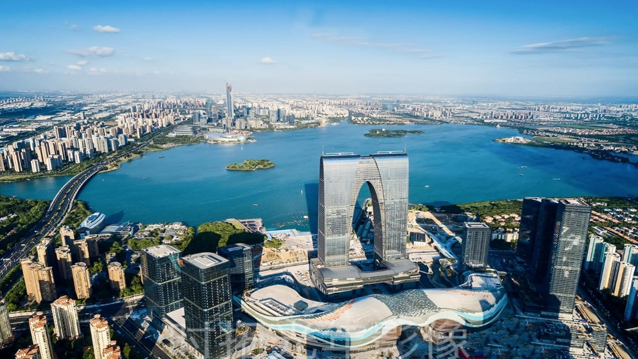 蘇州中心廣場項目位于蘇州工業園區金雞湖西側,毗鄰東方之門,居蘇州市域CBD核心位置,軌交1號線、6號線貫穿整個項目區域,整體占地21.1公頃,凈地面積13.9公頃,總建筑面積約182萬平方米,其中地上建筑面積130萬平方米、地下建筑面積52萬平方米。