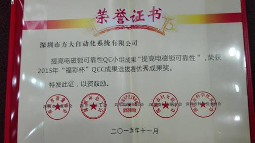 1120日,由深圳市質量協會、深圳市總工會、共青團深圳市委員會、深圳市婦女聯合會和深圳市科技技術協會聯合評定的福彩杯優秀QCC成果優秀獎揭曉。方大集團股份有限公司全資子公司深圳市方大自動化系統有限公司提高電磁鎖可靠性QC小組榮獲深圳市2015福彩杯’QCC成果選拔賽優秀獎,自動化公司質量安全部黃良江榮獲深圳市質量管理小組活動卓越領導者稱號。