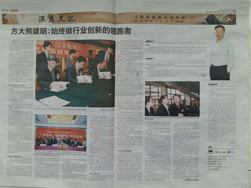 2016年12月7日,《深圳晚報(bào)》深商史記欄目以兩個(gè)整版超大篇幅報(bào)道方大集團(tuán)股份有限公司董事長熊建明的風(fēng)雨創(chuàng)業(yè)歷程,講述了熊建明董事長20多年來在建筑新材料、節(jié)能環(huán)保等行業(yè)領(lǐng)域的奮斗故事,記錄了他把方大集團(tuán)從3萬元起家、市場為零的小公司,培育成領(lǐng)先國內(nèi)同行、坐擁多項(xiàng)技術(shù)成就獎(jiǎng)的領(lǐng)袖級企業(yè)的傳奇經(jīng)歷,淋漓盡致地展現(xiàn)了熊建明董事長“敢為天下先”的奮斗姿態(tài)和樸實(shí)的創(chuàng)業(yè)情懷。