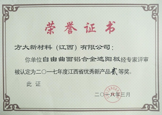 近日,江西省工信委在全省工業(yè)和信息化技術(shù)創(chuàng)新工作會(huì)公布了2017年度優(yōu)秀新產(chǎn)品獲獎(jiǎng)名單,方大集團(tuán)全資子公司方大新材料(江西)有限公司的“青花瓷鋁單板”、“自由曲面鋁合金遮陽(yáng)板”兩項(xiàng)新產(chǎn)品獲得了2017年江西省優(yōu)秀新產(chǎn)品二等獎(jiǎng)。