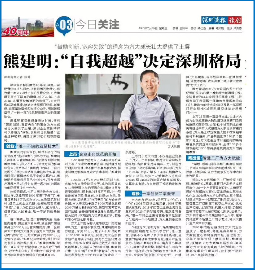 深圳經濟特區建立40年來,就是一部民營經濟從小到大、從弱到強的發展史。作為首批A+B股上市的民營企業,方大集團書寫出了漂亮的篇章。創立29年、上市25年,在董事長熊建明的帶領下,方大已形成高端幕墻、軌道交通屏蔽門設備、新能源、總部基地建設四大核心業務,用創新和堅守、一磚一瓦構筑起領跑產業的牢固地位。