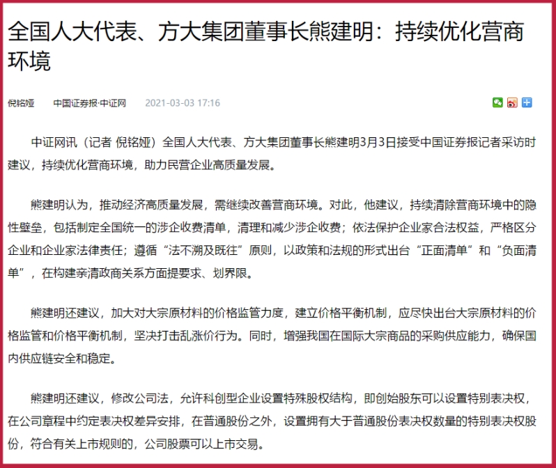3月3日,中證網刊發方大集團董事長熊建明兩會專訪報道《全國人大代表、方大集團董事長熊建明:持續優化營商環境》